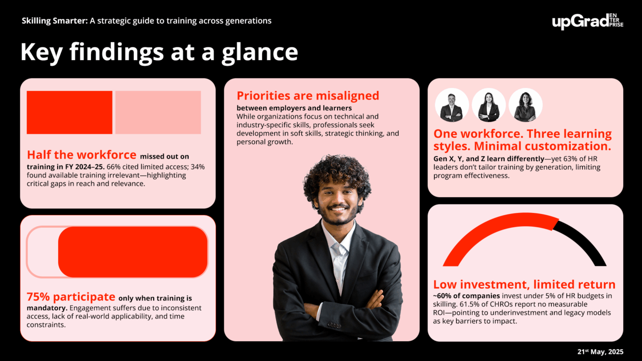 New report urges India Inc. to rethink skilling strategies as participation gaps, generational divides, and ROI concerns widenupGrad Enterprise – the corporate skilling division of Asia’s leading integrated lifelong learning company, upGrad has launched a groundbreaking industry report titled ‘Skilling Smarter: A Strategic Guide to Training